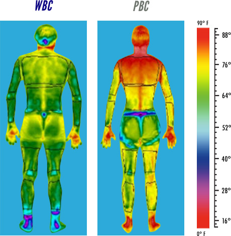 3 minute exposure comparison of WBC (-166°F) vs PBC (-256°F) Skin Temperature measurements upon exit (and other markers)
